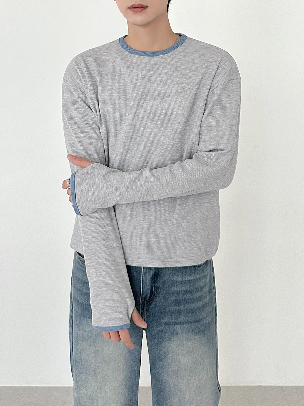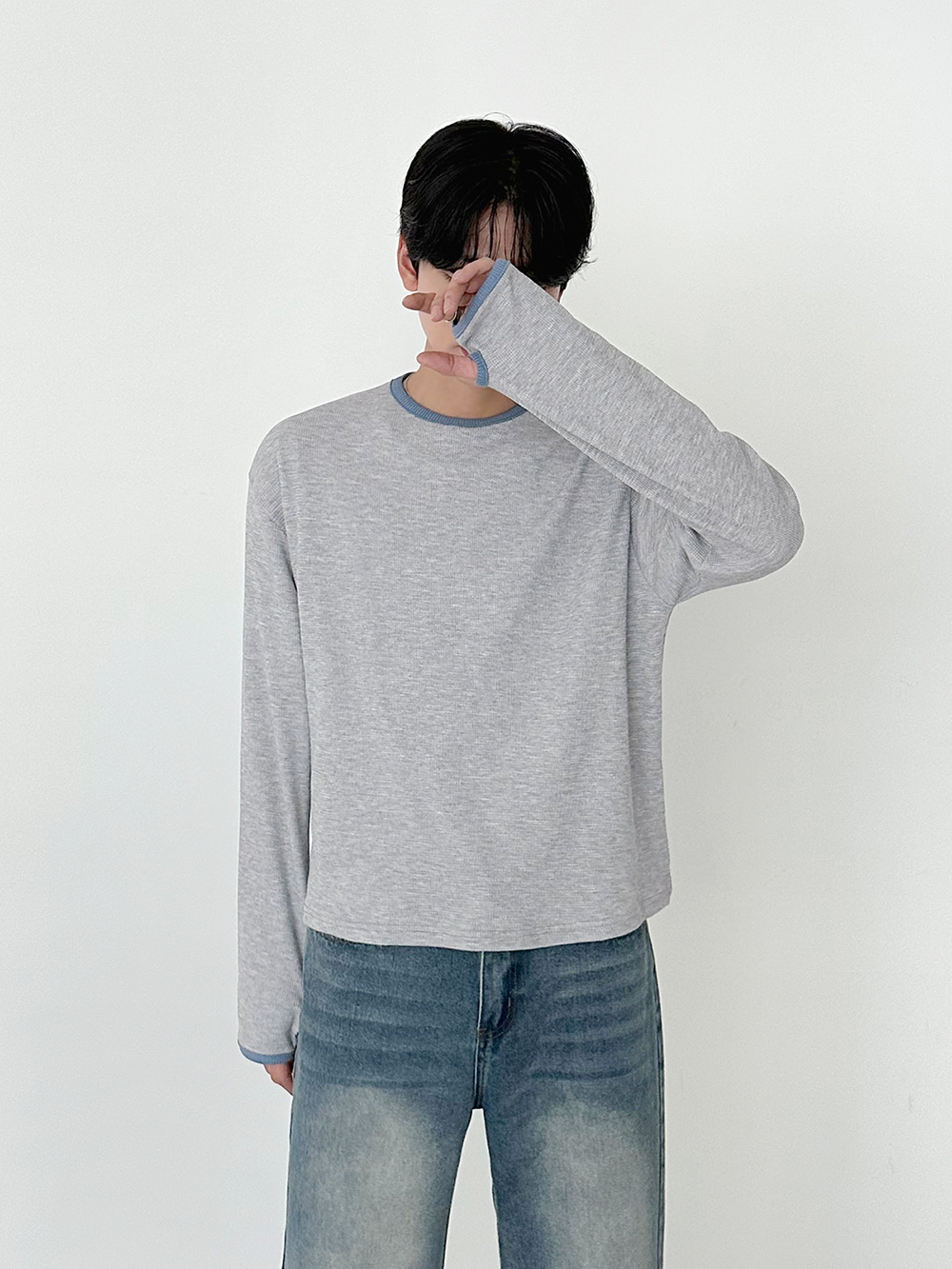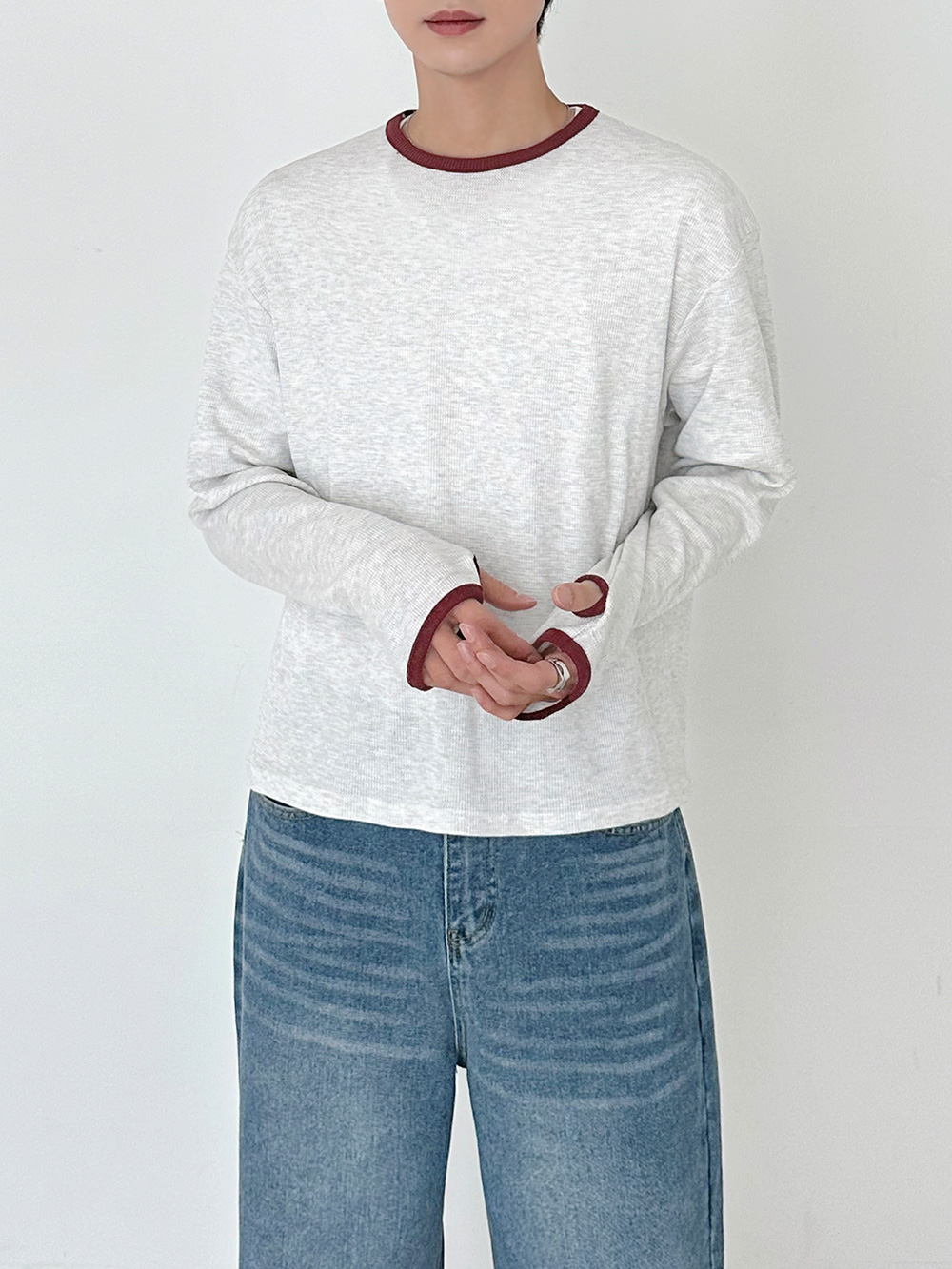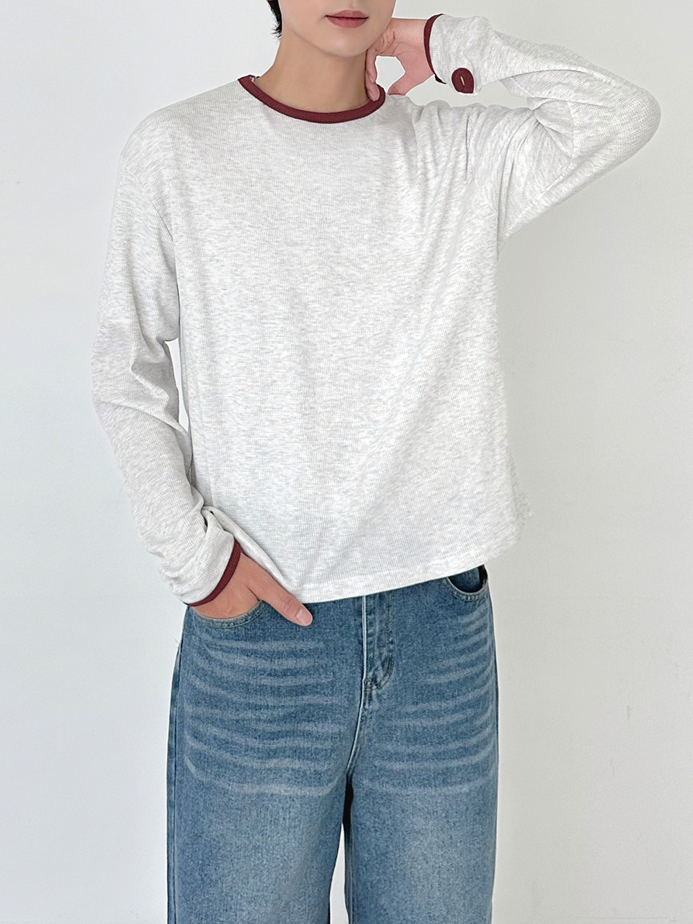 華夫格撞色短版長袖T卹 31078